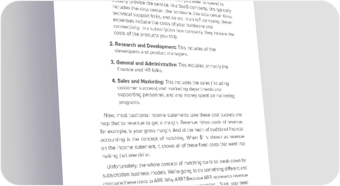 Chapter 1 Subscription Economics: How Recurring Revenue Changes Everything Recurring Costs In a SaaS company, there are really just three sources of costs: people, data center, and sales and marketing. In the subscription income statement these costs are allocated into four key buckets: 1. Costs of Revenue: Otherwise known as COGS (costs of goods sold), which is how much you need to spend to actually provide the service. In a SaaS company, this typically includes the data center, the hardware, the data center folks, technical support folks, and so on. In an IoT company, these expenses include the costs of your hardware and connectivity. In a subscription box company, they include the costs of the products you ship. 2. Research and Development: This includes all the developers and product managers. 3. General and Administrative: This includes primarily the finance and HR folks. 4. Sales and Marketing: This includes the sales (including customer success) and marketing departments and supporting personnel, and any money spent on marketing programs. Now, most traditional income statements take these cost buckets and map that to revenue to get a margin. Revenue minus costs of revenue, for example, is your gross margin. And at the heart of traditional financial accounting is the concept of matching. When $1 is shown as revenue on the income statement, it shows all of these fixed costs that went into making that one dollar. Unfortunately, the whole concept of matching starts to break down for subscription business models. We’re going to do something different and compare these costs to ARR. Why ARR? Because ARR represents revenue acquired in previous periods, which is now recurring. Sure, you need to keep servicing your customers, so COGS and G&A should match to ARR. How about R&D? Well, the traditional view says the products you’re selling today are already done, and you’re investing in research to create innovations that drive future sales. But here’s the thing: The customers of SaaS companies did not sign up for a static service that never gets better.