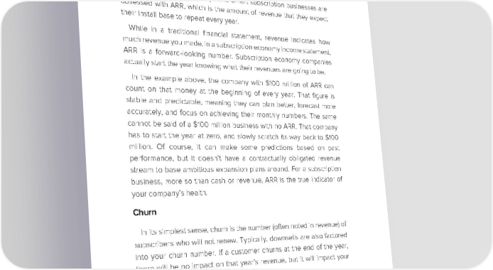 Chapter 1 ARR The first thing to notice here is that instead of starting and ending with net income, now we’re starting and ending with ARR. That’s because smart subscription businesses know that not all revenue is revenue, just like you and I know that there is a difference between a one-time payment and a recurring payment. Smart subscription businesses are obsessed with ARR, which is the amount of revenue that they expect their install base to repeat every year. While in a traditional financial statement, revenue indicates how much revenue you made, in a subscription economy income statement, ARR is a forward-looking number. Subscription economy companies actually start the year knowing what their revenues are going to be. In the example above, the company with $100 million of ARR can count on that money at the beginning of every year. That figure is stable and predictable, meaning they can plan better, forecast more accurately, and focus on achieving their monthly numbers. The same cannot be said of a $100 million business with no ARR. That company has to start the year at zero, and slowly scratch its way back to $100 million. Of course, it can make some predictions based on past performance, but it doesn’t have a contractually obligated revenue stream to base ambitious expansion plans around. For a subscription business, more so than cash or revenue, ARR is the true indicator of your company’s health. Churn In its simplest sense, churn is the number (often noted in revenue) of subscribers who will not renew. Typically, downsells are also factored into your churn number. If a customer churns at the end of the year, there will be no impact on that year’s revenue, but it will impact your ARR. Churn sucks, but even if you’ve got the best offering in the market, you’ll still have customers that leave you — they switch business models, or your competitor poaches them with a shameless discount. Taking this into account, you’ll need to subtract your expected churn in the top-line from your ARR for the year to get a net ARR.