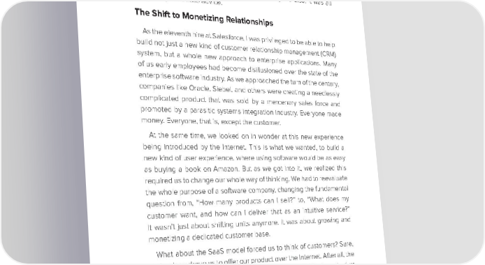 Chapter 1 Subscription Economics: How Recurring Revenue Changes Everything For what it’s worth, all the major MBA programs were just as widget- obsessed (at least mine was). I was taught that the fundamental goal of business is to create a hit product. Then, I had to sell as many units of that product as possible, thereby spreading my fixed costs over as many units as I could, so I could compete on the all-powerful margin. All I had to do was deploy SAP better than everyone else. It was all completely worthless advice. The Shift to Monetizing Relationships As the eleventh hire at Salesforce, I was privileged to be able to help build not just a new kind of customer relationship management (CRM) system, but a whole new approach to enterprise applications. Many of us early employees had become disillusioned over the state of the enterprise software industry. As we approached the turn of the century, companies like Oracle, Siebel, and others were creating a needlessly complicated product that was sold by a mercenary sales force and promoted by a parasitic systems integration industry. Everyone made money. Everyone, that is, except the customer. At the same time, we looked on in wonder at this new experience being introduced by the Internet. This is what we wanted, to build a new kind of user experience, where using software would be as easy as buying a book on Amazon. But as we got into it, we realized this required us to change our whole way of thinking. We had to reevaluate the whole purpose of a software company, changing the fundamental question from, “How many products can I sell?” to, “What does my customer want, and how can I deliver that as an intuitive service?” It wasn’t just about shifting units anymore. It was about growing and monetizing a dedicated customer base. What about the SaaS model forced us to think of customers? Sure, technology drove us to offer our product over the Internet. After all, the vision was as easy as buying a book on Amazon. But that required us to think of what we did as a service, something that people subscribed to, and that forced us to put ourselves in a position in which we were always working to please the customer. All of a sudden, we cared less about what product features sounded cool, and focused instead on what customers were using and what they actually needed.