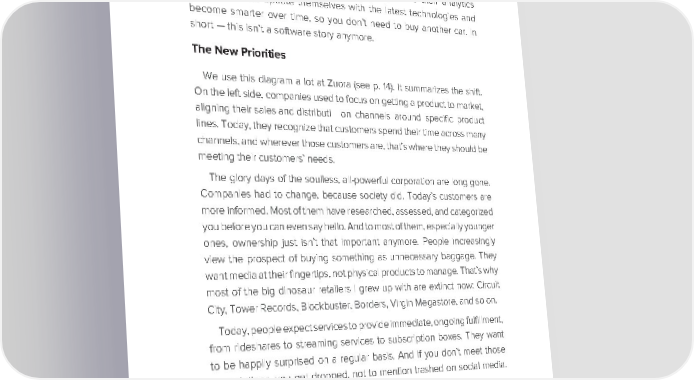Chapter 1 Subscription Economics: How Recurring Revenue Changes Everything One simple but effective way of looking at this is that companies have started to sell outcomes, using their product as a means to an end. Uber and Lyft sell you the ride, not the car. Caterpillar used to sell movers to construction companies. Now it asks them how much dirt they need moved. Health trackers are throwing in their actual product for free, in exchange for a 12-month subscription to their analytics platform. Teslas update themselves with the latest technologies and become smarter over time, so you don’t need to buy another car. In short — this isn’t a software story anymore. The New Priorities We use this diagram a lot at Zuora (see p. 14). It summarizes the shift. On the left side, companies used to focus on getting a product to market, aligning their sales and distributi on channels around specific product lines. Today, they recognize that customers spend their time across many channels, and wherever those customers are, that’s where they should be meeting their customers’ needs. The glory days of the soulless, all-powerful corporation are long gone. Companies had to change, because society did. Today’s customers are more informed. Most of them have researched, assessed, and categorized you before you can even say hello. And to most of them, especially younger ones, ownership just isn’t that important anymore. People increasingly view the prospect of buying something as unnecessary baggage. They want media at their fingertips, not physical products to manage. That’s why most of the big dinosaur retailers I grew up with are extinct now: Circuit City, Tower Records, Blockbuster, Borders, Virgin Megastore, and so on. Today, people expect services to provide immediate, ongoing fulfillment, from rideshares to streaming services to subscription boxes. They want to be happily surprised on a regular basis. And if you don’t meet those expectations, you get dropped, not to mention trashed on social media. It’s that simple. This means that everything has changed: how you design your service, how you engage with your customers, how you manage your company, heck, even how you define what really constitutes a company anymore. But as a first step, let’s start something more fundamental. Let’s explore the basic economics and components behind this unique new business model.