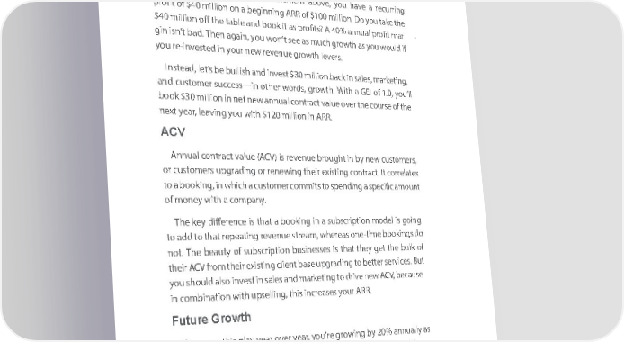 Chapter Chapter 1 1 investsinvests in a ciqnu airicnqgu iristrateging strategic cusctomer customers whos swhoe revese nurevee, nuande, profitand profits, s, won’two bnuild’t b uuildntil ulantertil layeterar s.ye Naoters. N thoteat ththeat grethea tergre atheter GtheEI, theGEI , lethess less efficientefficient the c theom pcanomyp isan ayt aisc tauat allyct uagrollyw groingw itings sa itless — sale js —ust the jus toppo the opposite site of whatof what you’d you ex’dpe cetx.pe A clot. wA GloEwI meGEansI me thansat thfora tthe for samthe esam numbe number of er of dollars,dollars, you’ll ge youn’ll geeratener moreate more sales sa, andles th, andat’ ths a agoodt’s a good thing thi. ng. In theIn stheubsc sriptioubscription incnome inc omestate mstaetentm abenovt abe, ovyoeu, hyoaveu haa vere cua rrinrecug rring profitprofit of $4 of0 m $4illio0 mn illioon na begion a nnbegiingnn ARRing ofARR $1 of00 $1 m00illio mn.illio Don yo. Duo t yoakeu thtae ke the $40 m$40illion m illionoff the off t atheble t aanbled b aooknd b itook as profitit as profits? A 40s? %A a40n%nua anl profitnual profit mar ma-r - gin isginn’t bisand’t. Thebadn. The aganin, a gyoaiun, w yooun ’wt seeon’ tas see muc as hmuc grohw groth asw thyo asu w yoouu lwd oif uld if you re-iyoun vestere-invested in yod inur nyoeuwr reve newnu revee gronuew th levers. growth levers. Instead, let’s be bullish and invest $30 million back in sales, marketing, Instead, let’s be bullish and invest $30 million back in sales, marketing, and cuandstomer customer succ essus—iccenss—i othern other words w, orgrowthds, growth. With. Witha GE Ia of G E1I. 0of, yo 1.u’0,l l you’ll book $30 million in net new annual contract value over the course of the book $30 million in net new annual contract value over the course of the next yeneaxrt ye, leaavir, nlega you vingw you ith w$12ith0 m $12illio0 mn illioin ARRn in . ARR. ACVACV AnnuAnnal counaltract con tractvalue v (aAluCeV) ( AisC reveV) isnu revee bnuroeu ghtbro uinght by i nne byw cusnewto cusmertosm, ers, or cuorstomer customers upgras udpgraing dorin reg nore wreinngew theiring theirexisti enxgis ctiontrng cacontrt. Itac correlt. It caorreltes ates to a bookingto a booking, in whi, inc hw ahi cuchs toa cumserto cmomerm comits tom itspes tond speingnd a isnpeg ac ifispec acmifiocun amt ount of moneyof money with w a coithm a pancomy.pany. The kTheey d kifferenceey difference is tha its ath baookit a bnookig inn ag subs in a criptiosubscription mond elm oisd goiel ins g going to addto to add that to repeatithat repeating revengnu revee snutreeam, stre wam,here washere onase-ti omne-tie bmookie bnookigs dno gs do not not. The beauty of subscription businesses is that they get the bulk of . The beauty of subscription businesses is that they get the bulk of their theirACV fro ACmV frotheirm theirexisting exis ctinglien tc baslienet basupgre adupgringad toing better to b etterservi cseervis. Bucet s. But you should also invest in sales and marketing to drive new ACV, because you should also invest in sales and marketing to drive new ACV, because in combination with upselling, this increases your ARR. in combination with upselling, this increases your ARR. Future GrowthFuture Growth If youIf r youun this run play this yeplayar overyear overyear, yeyouar’,re you gro’rew groingw biyn g20 b%y 20annua% annually as lly as long longas you as m youain mtaainin anta ieffin ancie effintc GEienI tr aGEtioI r(ifatio yo u(ifr yoGEuI ris G leEssI is th leanss th1.0an, yo 1.u 0, you growgro evenw even more). m ore).And wAnhedn w thehen time the timecome cos tom efisna tolly fi nastallyrt tsatakirtn tga profitsking profits, , you’re workiyou’re working offn g offof a muc of a much biggerh bigger recurri rencug reverring revenue snutree amstre. am. NoteNote that thithats isthi as basis aic bas overvieic overview of wthe of bus thei nbusessi nmeodelss m.odel There. There are are otherother factors factors at play at: playtota:l totaddalre adssabdrelessab malerk maet, one-tir m ket, one-tie samlees saandles c andosts costs impaimpcts, athects effects, the effects of ch ofur cn houn Grn EoI. I’n GmE sI. I’immplifyi simnplifyig forn cgl forarit cy.larity. 2222 2222
