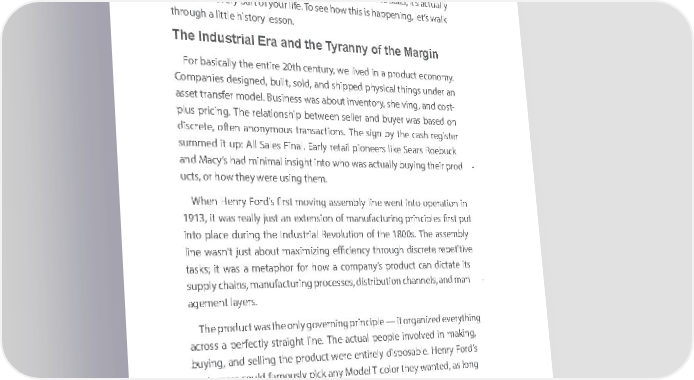 Chapter Chapter 1 1 WhileWhile most most people people think thi ofn SaaSk of SaaSas stri acstly stri ac tlytec ah nteologychnology vehi cvehile, itc’s le, it’s givengiven rise torise a ftoar am forear m funoredam funedamntale cnhtanal cghean, anged, thanadt’ sth theat’s b theirth bofirth a of a new businenew business modelss model — su — subscriptionbscriptions. Whens. W whene st wartee sdta Srtealeds Sforalecesfor.cocme .icn om in 1999,199 we9 re, wealized rea lizedwe were we weren’t sellin’tn sgelli prongduc protsduc anymorts anymore. Wee w. Weree w aserekin ag sking companiecompanies to subs tosc subribesc torib ae stoervi a cseervi wece w weree w cererea ticnrega. tiBungt . herBuet ’hers thee ’s the thing:thi Todang: yT,oda in 201y, in7 ,201 this7 b, thiusisn beusiss mneodelss m iodelsn’t li ismnite’t lidm toite SaaS,d to SaaS, it’s ac ittu’sall acy tually presentpre insent every in every part ofpa yort ofur yolifeu. rT olif seee. To how see thihows i sthi happes is happening,n letin’gs ,w letal’k s walk through through a littlea littlehistory his letorysso len.sson. The Industrial Era and the The Industrial Era and the Tyranny of the MarginTyranny of the Margin For basiForc basially ctheally e thentire e n20tireth 20cethnt uceryn, twuery lived, we livedin a proin ad uproct deucoctn eocmoyn. omy. shippeds iphycal thisicanlg this undngser und an er an CompanieCompanies dessigned designed, built, ,b soluiltd,, soland,d sahippend d phy assetasset transfer transfer mod elmo. Bduseli.n Beusssi nwaesss awabosu at boinveutn intorveyn, torshelviy, snhelvig, andng , candost- cost- plus plupricis npricig. Theng. relTheatio relnsatiohipns bhipetw beeetnw seeellern s ellerand buandyer bu wasyer baswase dbas on ed on discretdisec, retoftene, often anon aymononusymo tranuss tracantiosnsactio. Thens. sTheign sbyig nthe by cas theh casregihs teregir ster summsumed mit edup :it All up S: aAllles S Fialenals .Fi Enaalrly. Eretarlyail ret pioailn eerspion lieerske S liekaer sS Reoearsbuc Roek buck and Macyand Macy’s had’s mi handi mmialn iinsmalight ins iightnto winhoto wwhoas ac wtasua acllyt uabuyillyn bguyi theirng theirprod pro-d - ucts, oruct hows, or howthey they werew usereing us theingm the. m. WhenWhe Hennry He Fornryd ’Fors firds’ts mfirovingst moving assem assblyem linbely wlinene tw intoent operinto aopertiona itionn in 1913,1913, it wa its rewaallys re juastlly an ju stex anten esioxtenn ofsio mann of ufmanactufuringactu priringnc priiplencs iplefirsts pfirust t put into plinatoce pl dauringce during the In thedu sIntridual sRtrievolutioal Revolution of then of 1 the800s. 18 The00s. assThee mbassley mbly y throduighscrete discrete repetitiv repetitive e line wlineasn w’t asjustn’t ajustbout a bmaoutximizi maximizing effingc ieeffinccyie thronc ugh tasks;t aits kwas; its awa mets aa metphora phorfor how for howa co ma paconmypa’s prony’sduc prot duccant dcanictate dic ittates its supplysupply chain chains, manus, manufactufarincgtu proringc eprossecs,e sdseistribs, diustiotribnu ctiohannn chelanns, andels ,ma andn ma-n - agemageent lmaent lyersa. yers. The proThed uproct waducst the wa so thenly goveronly governing prininncg priiplenc — ipleit — orgitan orgizedan everythiized everything ng acrossacross a perfectly a perfectly straight stra liightne. Theline. aThectua alct peopleual people involve involved in mad inki nmag, king, buying,buying, and selliandn sellig theng pro theduc prot ducweret were entirely entirely dispo dsabispolesab. Helen.ry He Fordnry ’Fords ’s customercustomers coulds could famo fuamslyo piuslyck apinyck Mo anyd elMo T dcelolor T c theyolor theywanted wan, ateds lo, nag s long as it waas it was blacks bl. ack. The resTheu ltres ofu altll of thi asll relentlethis relentless efficiess efficiency wasncy thwasat Hethantry He Fornryd ’Fors cods’st cost per upernit droppeunit dropped predc ipitoprecusipitoly, usallowily, anllowig hinmg tohim flood to flood the matherk maet wrkiteth with cheapche butap d butura bledur caablers. caMors.d elMo Tsd oeln Tlys camonlye cam in belac ink b blacecausk beecaus withe wonithe one line every three three minute mis,n utethas,t wasthat thewas o thenly only automoautomobile cbomingile coming off the off li thene every color thcolor that wouldat would dry f asdryt eno fast enough. ugh. 1010 1010