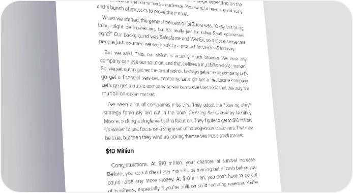 Chapter 3 The Climb: How to Get to $10 Million more money to do the next round, you’ll want to know the answer to that question. When you were raising your seed round or A round, it was all hopes and dreams. But once you’re a real business, investors will focus more on how big this market really is. It’s okay to have a $500 million market, but then the amount of money that you raise and your exit strategy will both change depending on the ultimate size of that commercial audience. You want to have a great story and a bunch of statistics to prove the market. When we started, the general perception of Zuora was, “Okay, this billing thing might be interesting, but it’s really just for other SaaS companies, right?” Our background was Salesforce and WebEx, so it made sense that people just assumed we were strictly a product for the SaaS industry. But we said, “No, our vision is actually much broader. We think any company can use our solution, and that defines a multibillion-dollar market.” So, we set out to gather the proof points. Let’s go get a media company. Let’s go get a financial services company. Let’s go get a healthcare company. Let’s go get a public company so we can prove the thesis that this truly is a multibillion-dollar market. I’ve seen a lot of companies miss this. They adopt the “bowling alley” strategy famously laid out in the book Crossing the Chasm by Geoffrey Moore, picking a single vertical to focus on. They figure to get to $10 million, it’s easier to just focus on a single set of homogenous customers. That may be true, but then they wind up boxing themselves into a small market. $10 Million Congratulations. At $10 million, your chances of survival increase. Before, you could die at any moment by running out of cash before you could raise any more money. At $10 million, you don’t have to go out of business, especially if you’re built on solid recurring revenue. You’re turning into a real company. Remember that El Capitan climb I mentioned at the beginning of the chapter? That effort was actually 7–10 years in the making. That was a story of patience, calculation, and many failures before those two climbers ultimately succeeded. They endured many switchbacks of their own. As you head toward $30 million and $100 million there will be new challenges to consider. But now, you’re on your way.