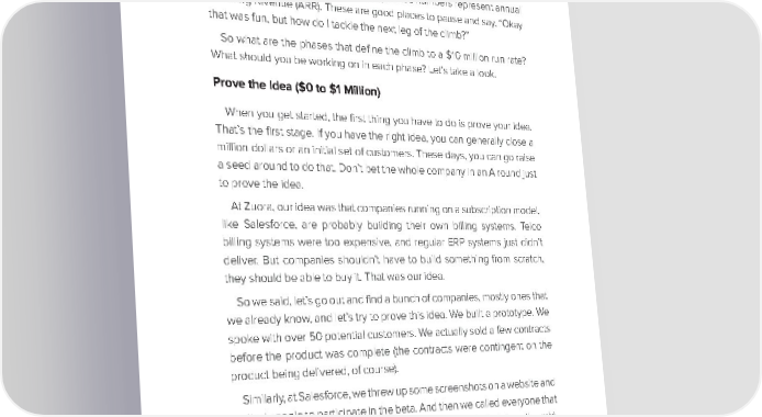 And the things that made it successful in the last stage, may actually hold it back from succeeding in the next one. You have to throw out the rules, bring out a clean sheet of paper, and redesign the company. After working with many companies, I’ve found it useful to use the ones and threes to mark off the stages of growth: $1 million, $3 million, $10 million, and so on. For a SaaS company, these numbers represent annual recurring revenue (ARR). These are good places to pause and say, “Okay that was fun, but how do I tackle the next leg of the climb?” So what are the phases that define the climb to a $10 million run rate? What should you be working on in each phase? Let’s take a look. Prove the Idea ($0 to $1 Million) When you get started, the first thing you have to do is prove your idea. That’s the first stage. If you have the right idea, you can generally close a million dollars or an initial set of customers. These days, you can go raise a seed around to do that. Don’t bet the whole company in an A round just to prove the idea. At Zuora, our idea was that companies running on a subscription model, like Salesforce, are probably building their own billing systems. Telco billing systems were too expensive, and regular ERP systems just didn’t deliver. But companies shouldn’t have to build something from scratch, they should be able to buy it. That was our idea. So we said, let’s go out and find a bunch of companies, mostly ones that we already know, and let’s try to prove this idea. We built a prototype. We spoke with over 50 potential customers. We actually sold a few contracts before the product was complete (the contracts were contingent on the product being delivered, of course). Similarly, at Salesforce, we threw up some screenshots on a website and invited people to participate in the beta. And then we called everyone that was interested, showed them the demo, and asked what they thought. We had 200 customers lined up when we launched in February 2000. You can sell an idea before you have a real, fully formed product. And you should. But by the time you start closing in on $1 million ARR, the idea should be proven.