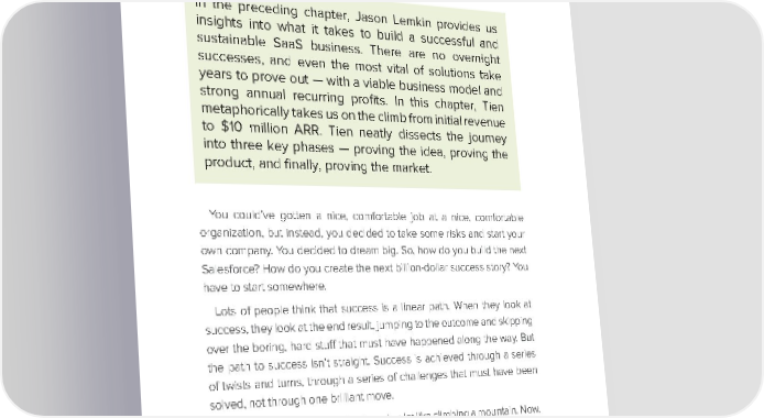 Chapter 3 The Climb: How to Get to $10 Million By Tien Tzuo In the preceding chapter, Jason Lemkin provides us insights into what it takes to build a successful and sustainable SaaS business. There are no overnight successes, and even the most vital of solutions take years to prove out — with a viable business model and strong annual recurring profits. In this chapter, Tien metaphorically takes us on the climb from initial revenue to $10 million ARR. Tien neatly dissects the journey into three key phases — proving the idea, proving the product, and finally, proving the market. You could’ve gotten a nice, comfortable job at a nice, comfortable organization, but instead, you decided to take some risks and start your own company. You decided to dream big. So, how do you build the next Salesforce? How do you create the next billion-dollar success story? You have to start somewhere. Lots of people think that success is a linear path. When they look at success, they look at the end result, jumping to the outcome and skipping over the boring, hard stuff that must have happened along the way. But the path to success isn’t straight. Success is achieved through a series of twists and turns, through a series of challenges that must have been solved, not through one brilliant move. I like to say that building a business is a lot like climbing a mountain. Now, unlike those two crazy guys that free-climbed El Capitan, most of us don’t scramble straight up 3,000 feet of granite when we go up a mountain. Instead, we make our way along a route that has lots of switchbacks. I like the metaphor of a switchback, because at each turn you’re doing an about-face. You’re completely switching directions. Similarly, when a company enters a new phase, it practically becomes a new organization.