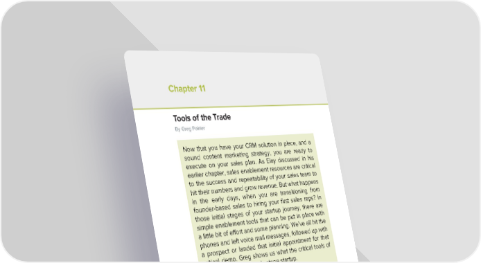 Chapter 10 Filling the Funnel with Content Marketing Chapter 11 Tools of the Trade By Greg Poirier Now that you have your CRM solution in place, and a sound content marketing strategy, you are ready to execute on your sales plan. As Elay discussed in his earlier chapter, sales enablement resources are critical to the success and repeatability of your sales team to hit their numbers and grow revenue. But what happens in the early days, when you are transitioning from founder-based sales to hiring your first sales reps? In those initial stages of your startup journey, there are simple enablement tools that can be put in place with a little bit of effort and some planning. We’ve all hit the phones and left voice mail messages, followed up with a prospect or landed that initial appointment for that critical demo. Greg shows us what the critical tools of success are for the early-stage startup. One of the most difficult things about joining a startup as a sales team member is the lack of sales enablement tools. Selling at a startup is a very different type of sale and often, tools like first-call decks and case studies are even more important than they are at established enterprises, because the sales team needs them to appear more credible. Positioning yourself as a winning company and appearing to be larger than you actually are is one of the most important roles that marketing has to play in supporting sales at a startup. There are many ways to accomplish this, but here are five tools (that you can create) that will align your marketing and sales teams on the same message: 1. Creative Communications Guide 2. First-Call Deck 3. Product One Sheets 4. Case Studies or Use Cases 5. Sales Quotes, Proposals, and Contracts