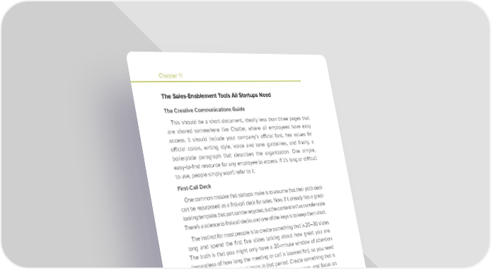 Chapter 11 Tools of the Trade The Sales-Enablement Tools All Startups Need The Creative Communications Guide This should be a short document, ideally less than three pages that are shared somewhere like Chatter, where all employees have easy access. It should include your company’s official font, hex values for official colors, writing style, voice and tone guidelines, and finally, a boilerplate paragraph that describes the organization. One simple, easy-to-find resource for any employee to access. If it’s long or difficult to use, people simply won’t refer to it. First-Call Deck One common mistake that startups make is to assume that their pitch deck can be repurposed as a first-call deck for sales. Now, if it already has a great- looking template, that part can be recycled, but the content isn’t as transferrable. There’s a science to first-call decks and one of the keys is to keep them short. The instinct for most people is to create something that is 20–30 slides long and spend the first five slides talking about how great you are. The truth is that you might only have a 20-minute window of attention (regardless of how long the meeting or call is booked for), so you need to cover your most critical items in that period. Create something that is 8–12 slides long, with your font size at 30-point or more, and focus on using imagery rather than many lines of copy. What to include: • Cover • Agenda • Where we are today • The problem • How we solve the problem • What makes us different • Final slide with contact information The key is to focus on explaining why the customer might be feeling pain, even if they aren’t aware of it. Remember, when you sell, you will most likely have to sell the potential customer that the pain point is actually there, and that they need to find a solution. Only then can you sell the solution you have to solve their pain. If people aren’t aware they have a headache, they won’t buy painkillers.